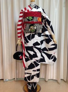 ◆振袖 和風館 鶴×矢羽根・赤×黒 ¥75,600(tax in)