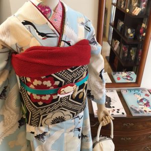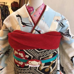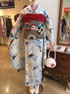 落ち着いた水色ベースに、おめでたい鶴と梅のお柄♪