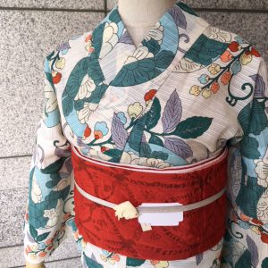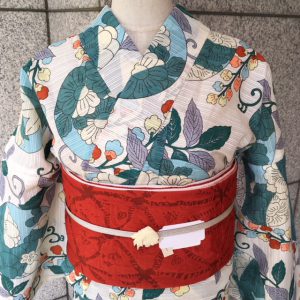 ▼半巾帯 きもの道楽 ふくれ麻の葉・朱赤 ¥12,960(tax in)