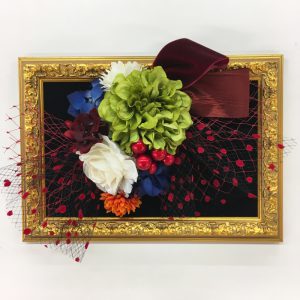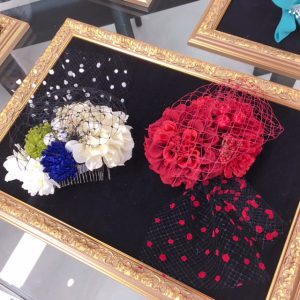 お色違いにはカラフルなコサージュに赤のレースがMIXに!