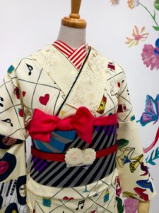 ポップな柄なので帯揚げの結び方もカワイく、リボンに