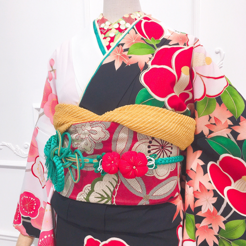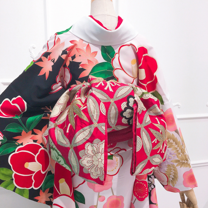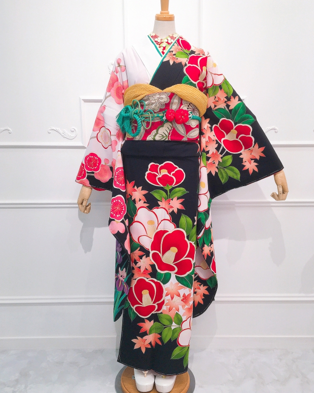 ▼きもの道楽 梅と椿と楓・黒 ¥140,400(tax in)