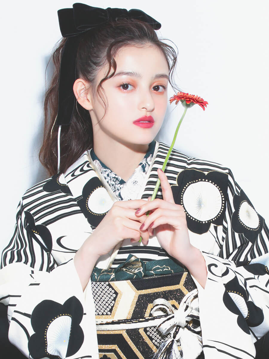 帯と振袖のコントラストをしっかりつけた方が冬タイプの顔立ちが引き立ちます。柄は写実的なものや幾何学柄など直線が入っているものがおすすめ。