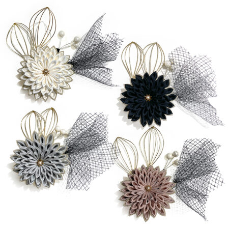 フォーマルなシーンにもぴったりな品のあるアイテムになっており、クリップとコーム付きなのでアレンジ自由自在!振袖・袴・普段着きものにも合わせて頂きやすいデザインです。また、二次会などのドレス、スーツにも合わせてご使用頂けます。