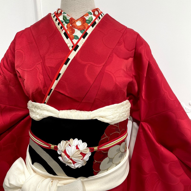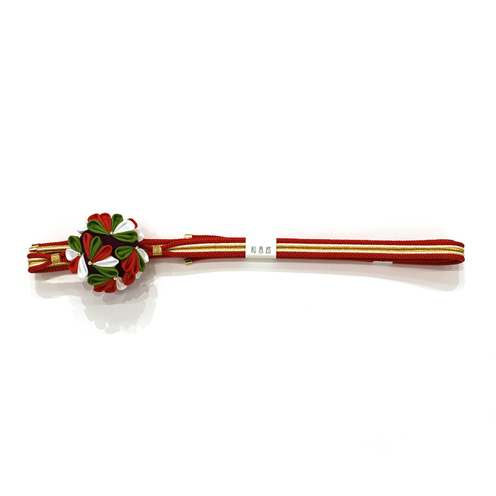 繊細なつまみ細工の花鞠菊は存在感もありレトロ・モダン・クラシカルなコーディネートにも合わせやすい帯締めです。振袖コーディネートを更に可愛く、引き締めるアイテムです。