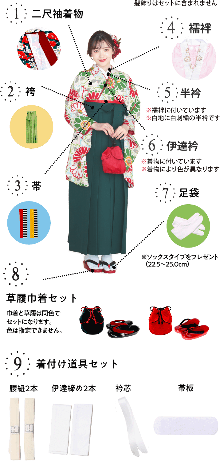 和風館ICHIの袴レンタルでは、袴の着付けに必要なものが